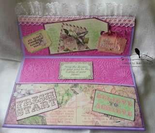 Here I have stuck down the embossed card to the wallet and folded up one side to make the pocket, I have also cut the paper and inked it. I also inked round the wallet.