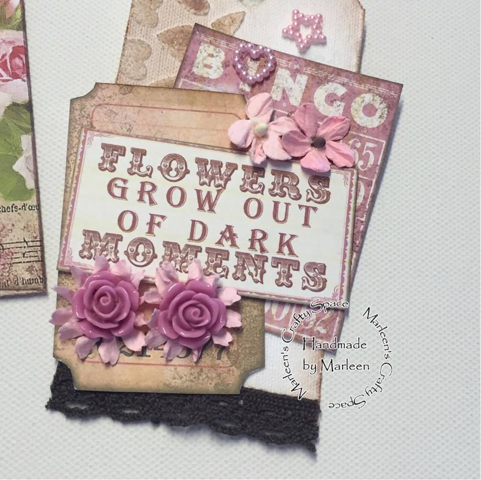 The tag is die cut from adhesive fabric and layered with a stencil and texture paste. Once dry I added distress inks and layered up the elements from the kit I wanted.