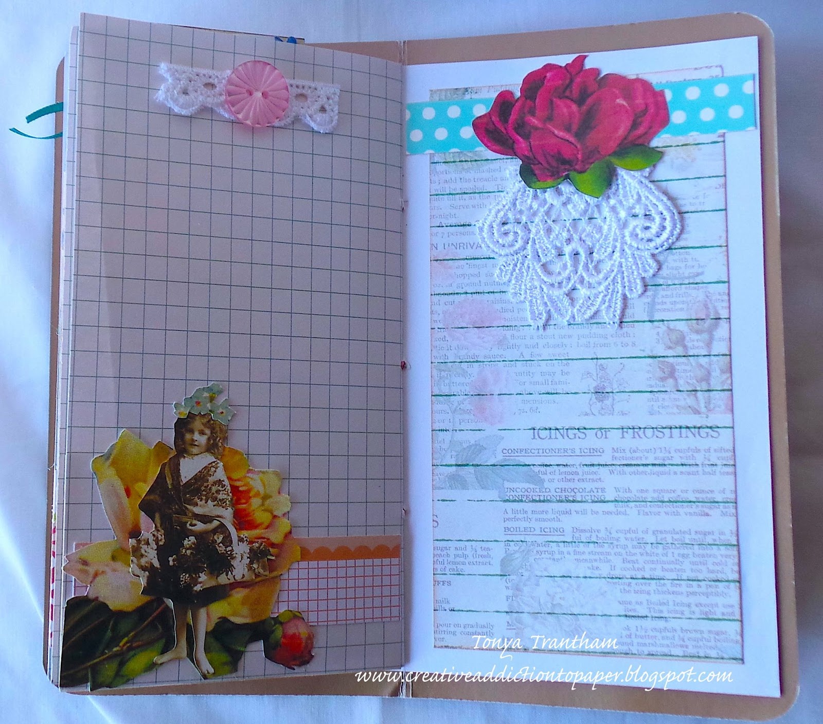 This month's junk journal for Tsunami Rose Designs I decided to create a traveler's notebook. I had a leftover file folder I had used to make some dash boards for my planner. I rounded the corners and folded in half to create a 4"x7 1/2" cover for my traveler's notebook. Next I cut ten sheets of grid cardstock to fit the inside of the notebook and sewed to the cover. I had leftover printables from the following kits from Tsunami Rose Designs: Tea Party Desserts, Small Mason Jars Collections 1, Decoupage Flowers Set #2 and Printable Ephemera Set # 8 - Vintage Childrens Photos. I thought it would be fun to enlarge some of the mason jars and use them as journaling spots in my notebook. After lots of fussy cutting I adhered the images to the pages and lightly embellished.
