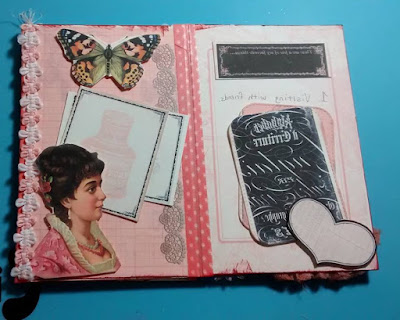 I cut the Rose Notecards papers down to 4 1/4 " long and then glued two of them together and then I stuck the pages together using washi tape. I fussy cut some of the ephemera to use as decorations and also in the tuck spots of my flip book. I added a doily to the front along with one of the ladies and pretty butterflies. I added some trim to some of the pages. I used my dies to cut out some of the cards so the friend I gift this to can use them in her projects. The quality of these images are amazing and great to work with.